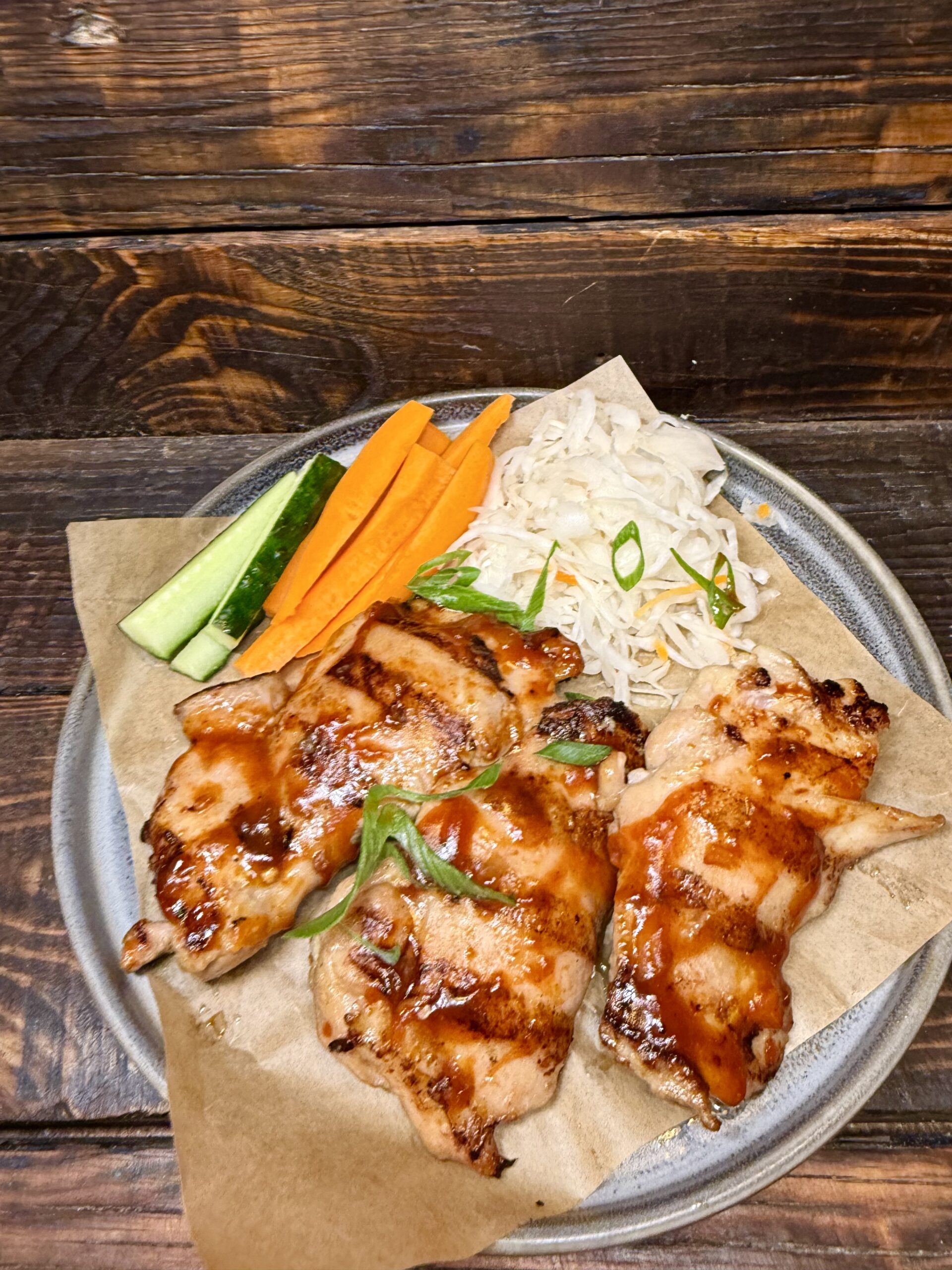 Бедро куриное на гриле, капуста квашеная, морковь, огурец.