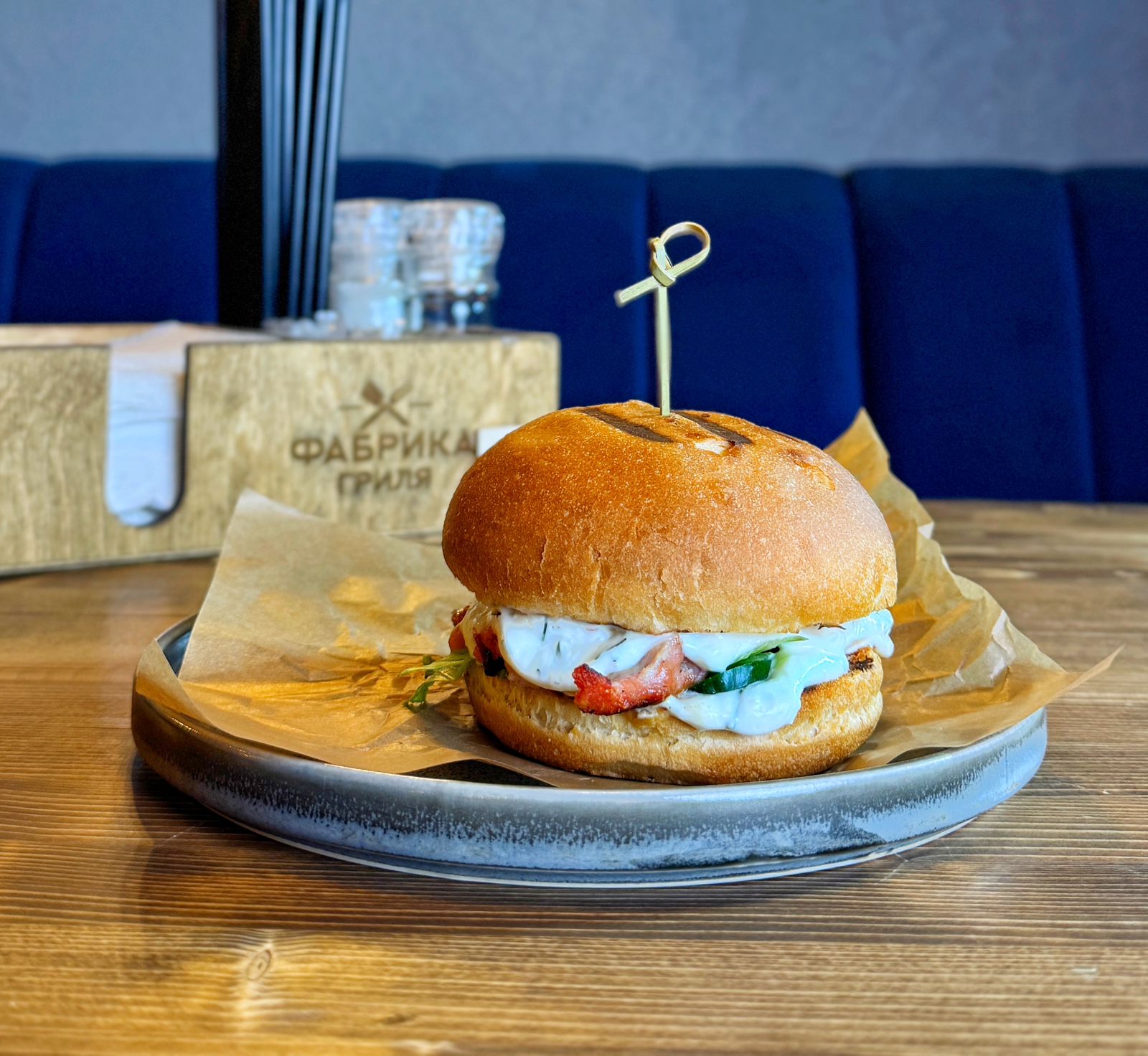Булочка, куриное бедро гриль, сыр чеддер, томат, огурец, айсберг, соус белый.