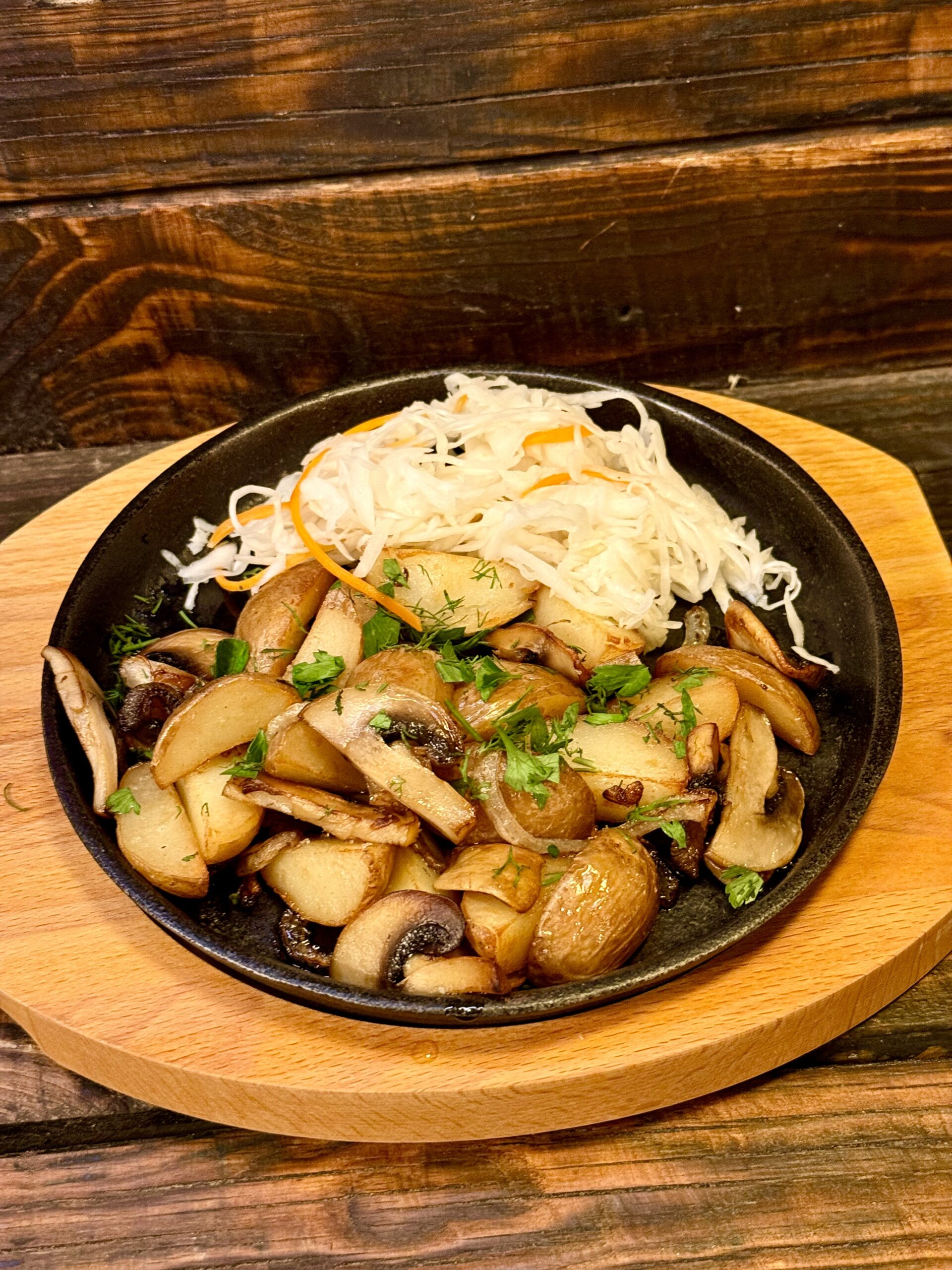 Картофель бейби, лук, шампиньоны, капуста квашеная.