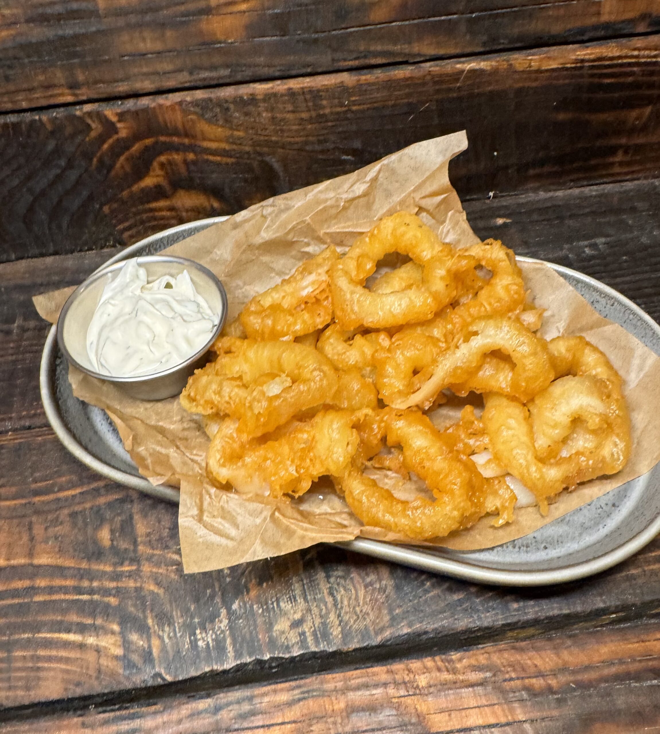 Кольца кальмара, соус чесночный.
