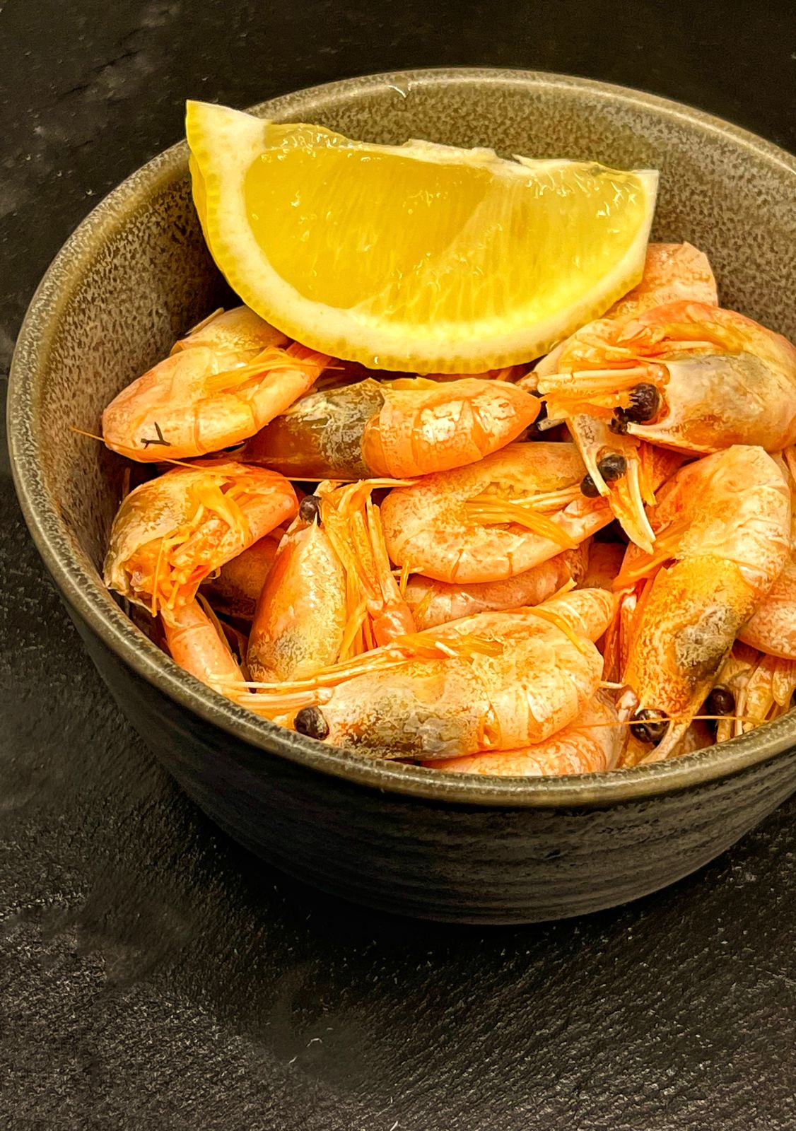 Креветки тигровые в панцире на гриле, лимон, чесночное масло.