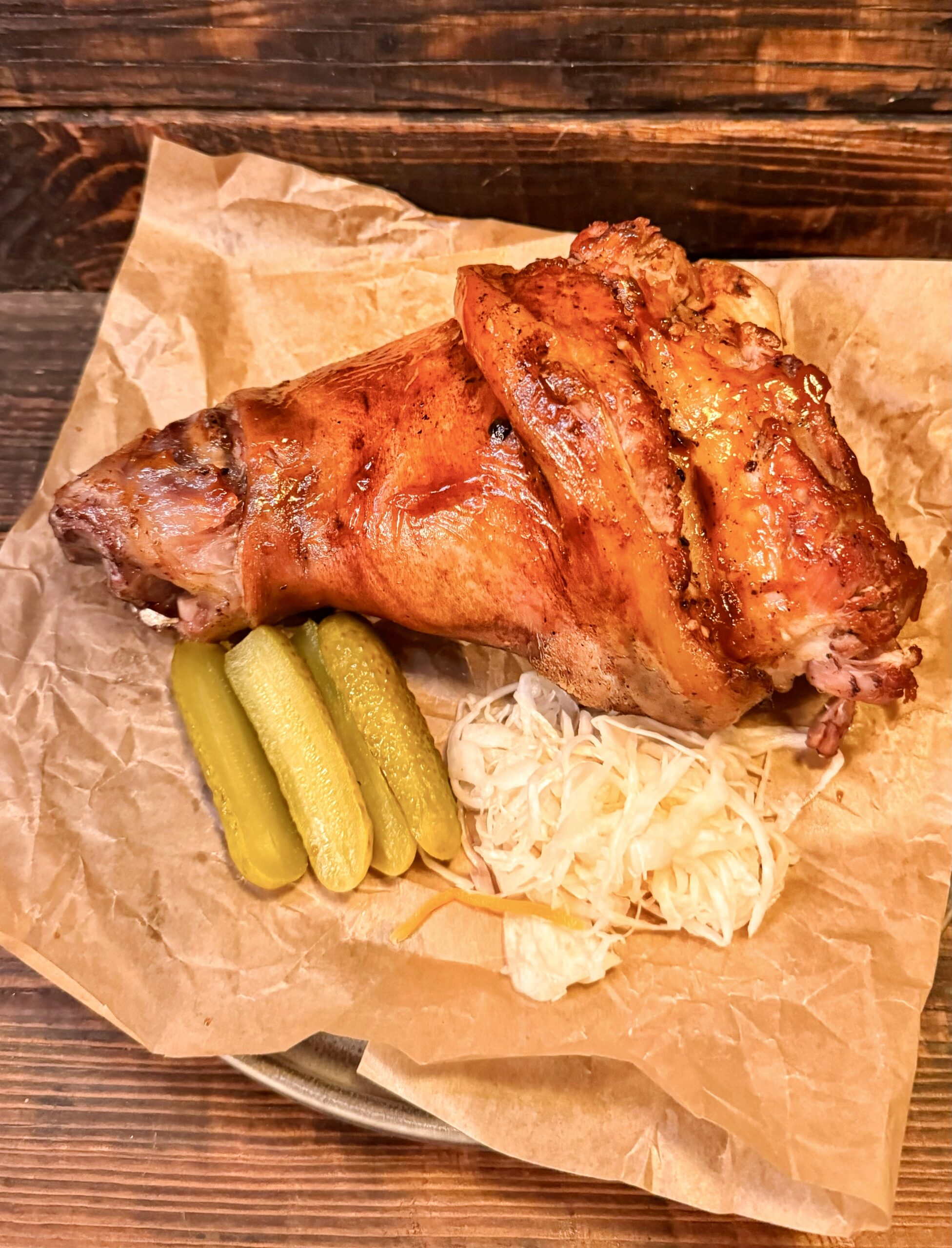 Рулька свиная гриль 1шт, капуста квашеная, огурец маринованный, соус BBQ.