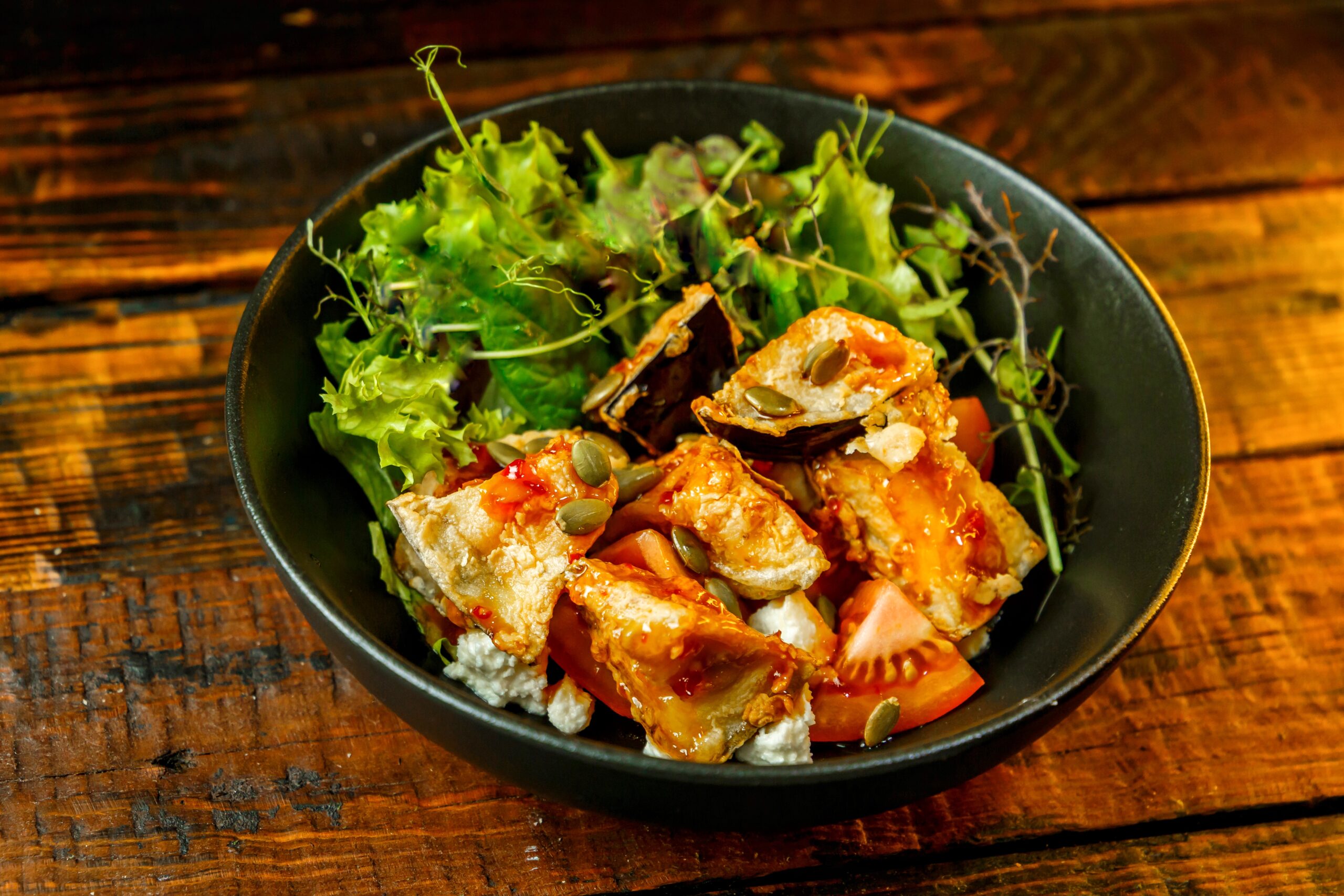 Бедро куриное на гриле, капуста квашеная, морковь, огурец.