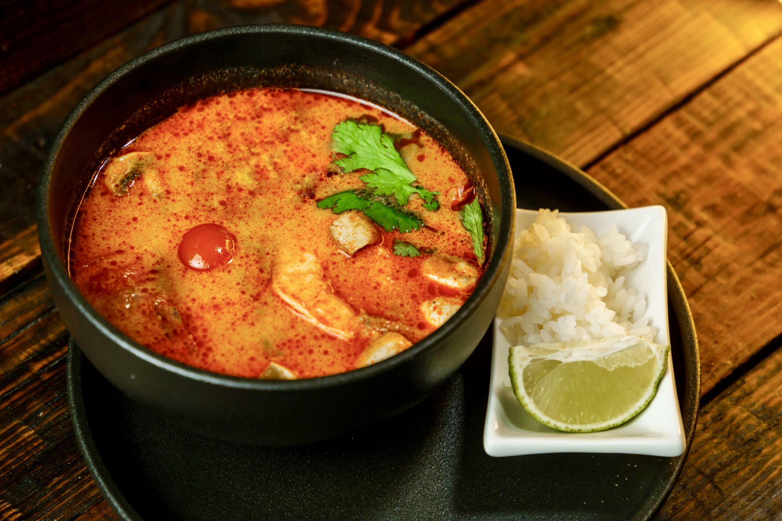 Бульон рыбный, кокосовое молоко, кинза, мидии, креветка, кальмар, лемонграсс, паста том ям, шампиньоны, томаты черри
